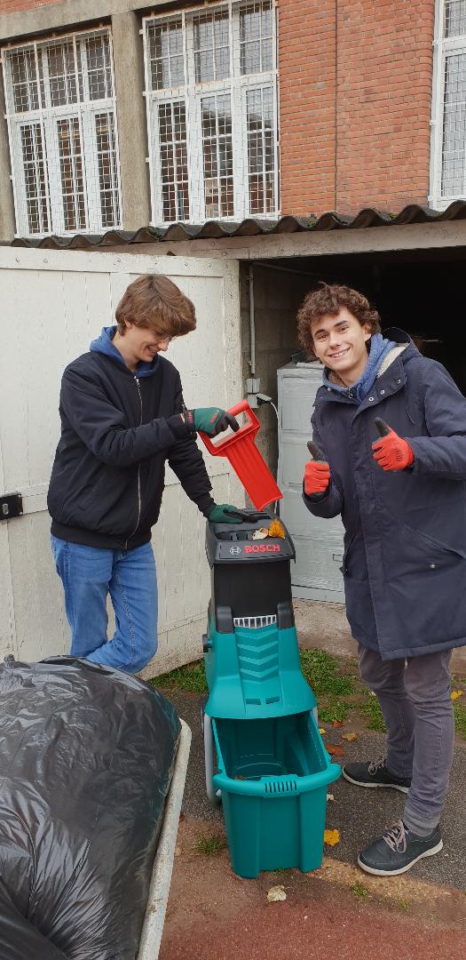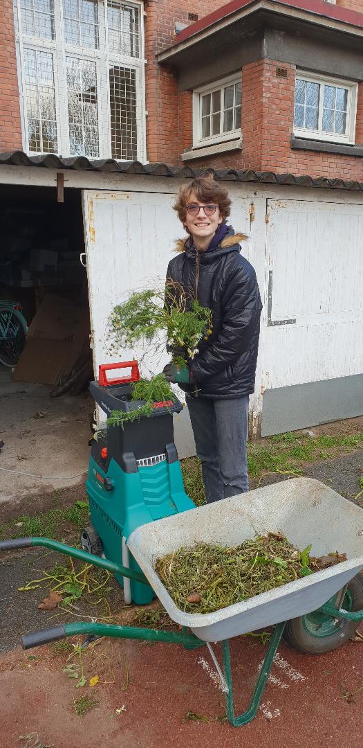 L’arrivée de la broyeuse pour former un broyat grossier pour le jardin fait des ravis (notamment Romain et Louis). Ce broyat a permis, durant l’hiver, de former une couverture qui protège la terre de l’alternance gel/dégel.