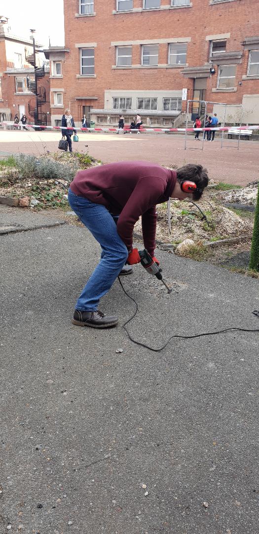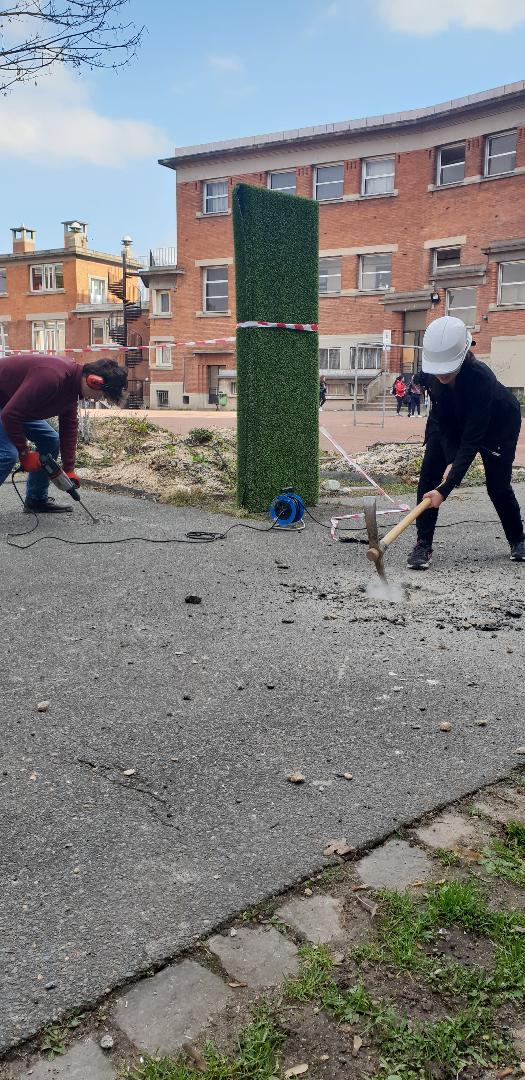 Le début des travaux dans le cadre de la construction de la pergola du lycée. Cette pergola, qui fera au sol 20 m², a besoin de fondation solide. Nous devons donc tout d’abord casser le goudron, faire de gros trous pour les combler avec du béton.