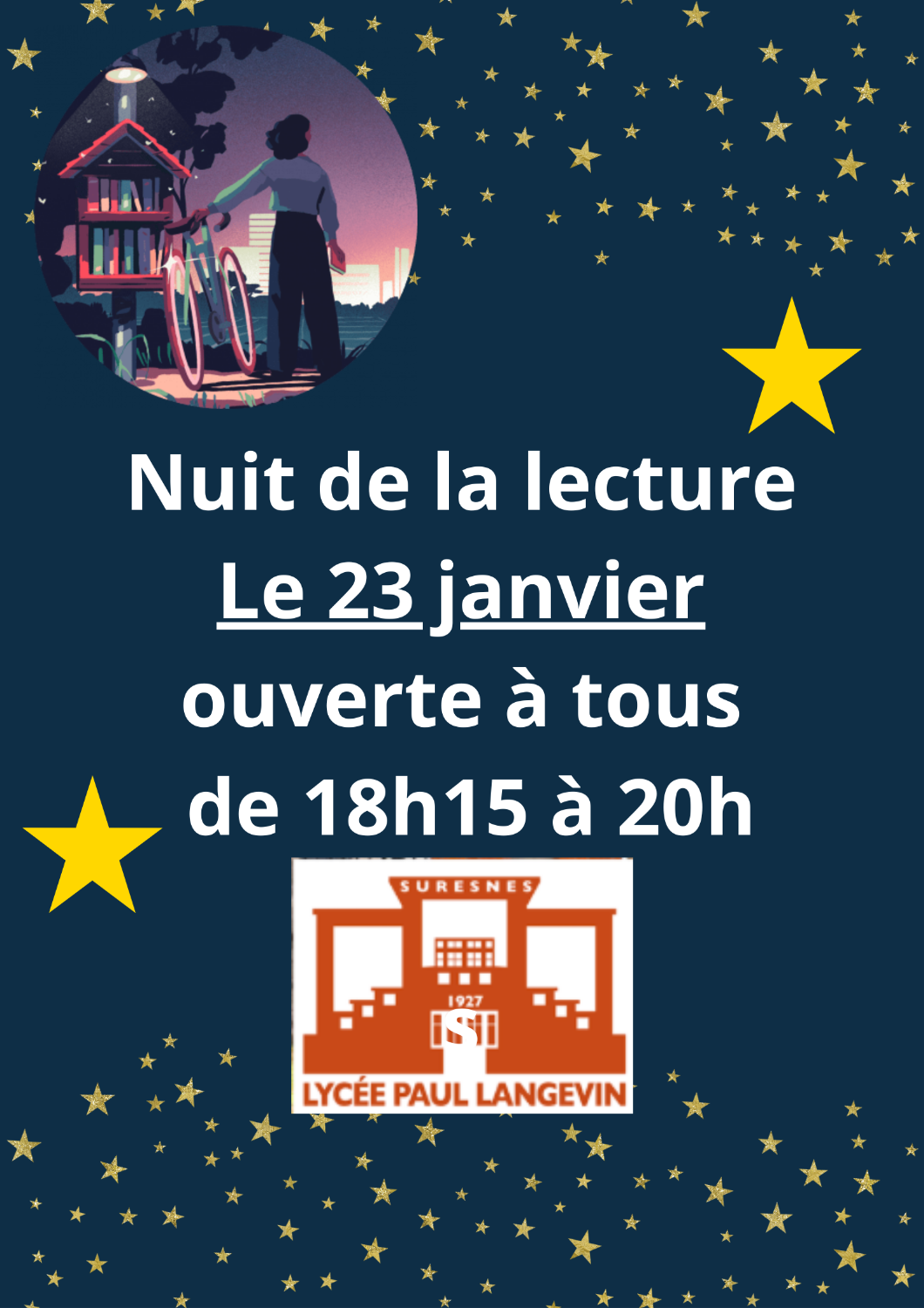 NUIT DE LA LECTURE 2026 jeudi 15 janvier 2026 par Mélie Jouassin Nuit de la lecture au lycée Paul Langevin Avec la participation des classes de 201, 203, 202, 204, 209, 207 Bachibac, les élèves de l’option grec, du club Paul Jardin et quelques élèves de spécialité Histoire des arts de Tle.